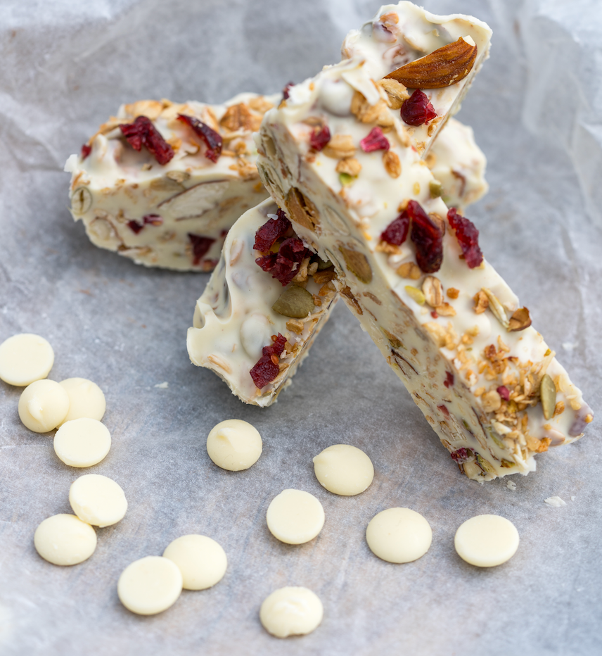 Økologiske hvide chokoladedråber som kan bruges i kager og bagværk eller smeltes og tempereres til overtræk til konfekt, flødeboller og fyldte chokolader.